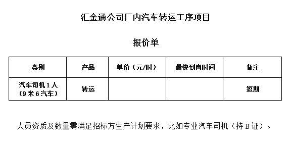 匯金通公司廠內(nèi)汽車轉(zhuǎn)運(yùn)工序項(xiàng)目公開招標(biāo)公告