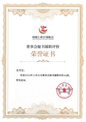 公司董事會秘書榮獲中國上市公司協(xié)會“2024上市公司董事會秘書履職評價”4A評級。